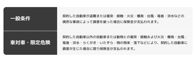車両保険はさらに「一般条件」と「車対車・限定危険」の2種類に分かれます。