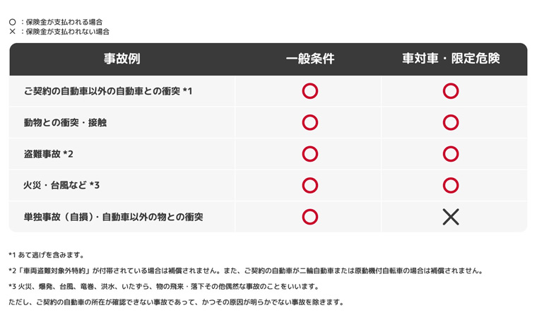 「車対車・限定危険」は「一般条件」に比べて保険料が割安になりますが、「単独事故」「相手がわからないあて逃げ」は対象外となります。